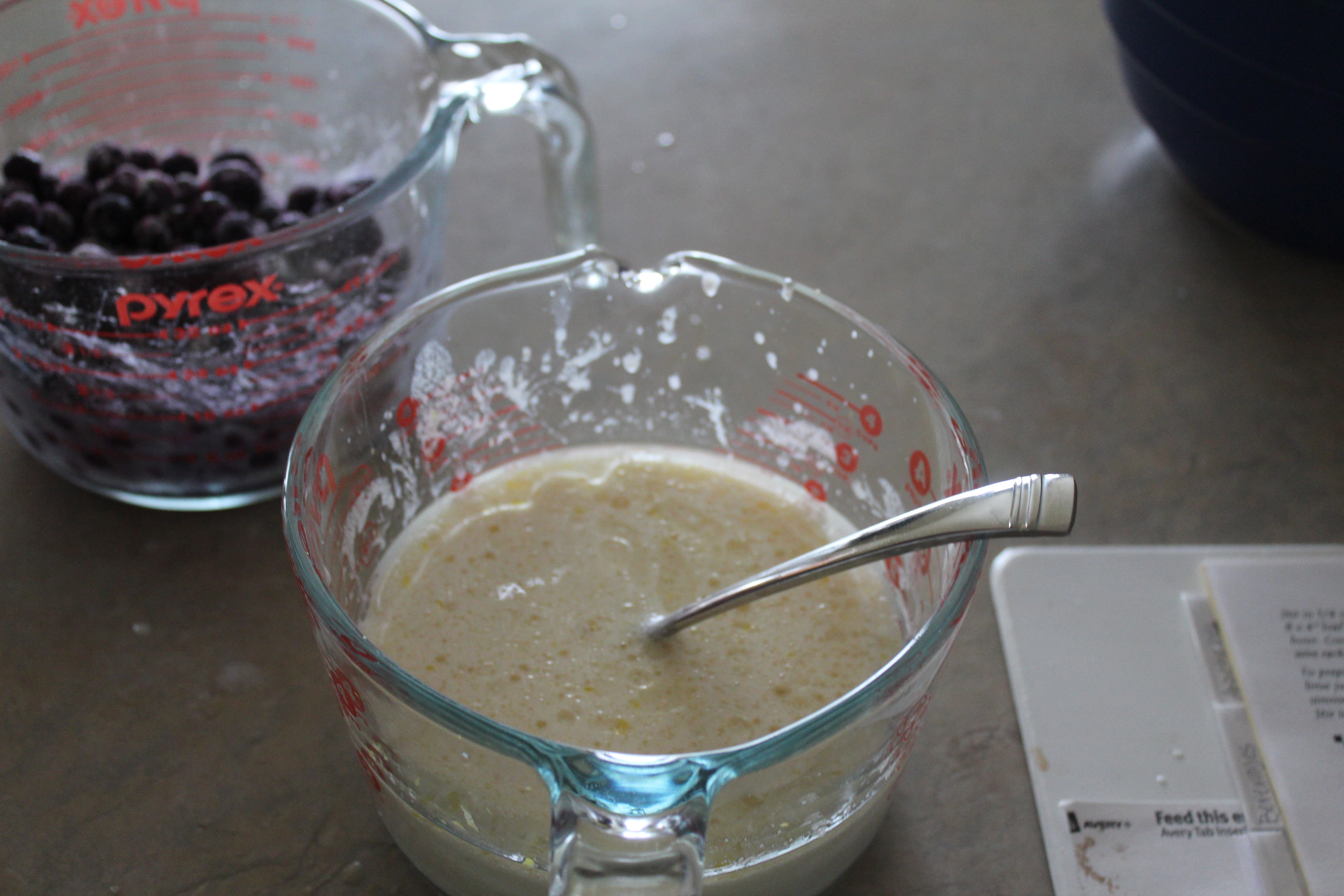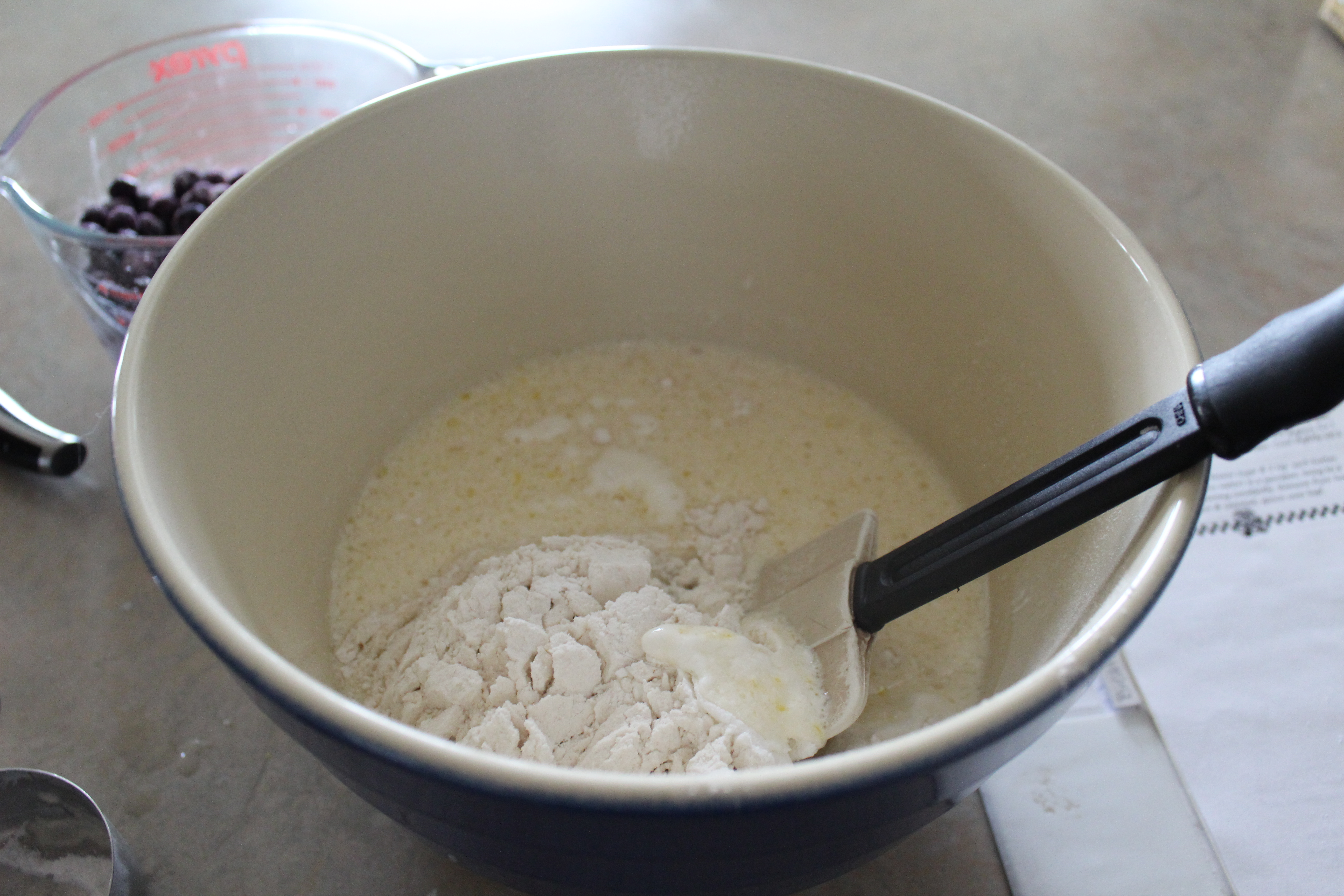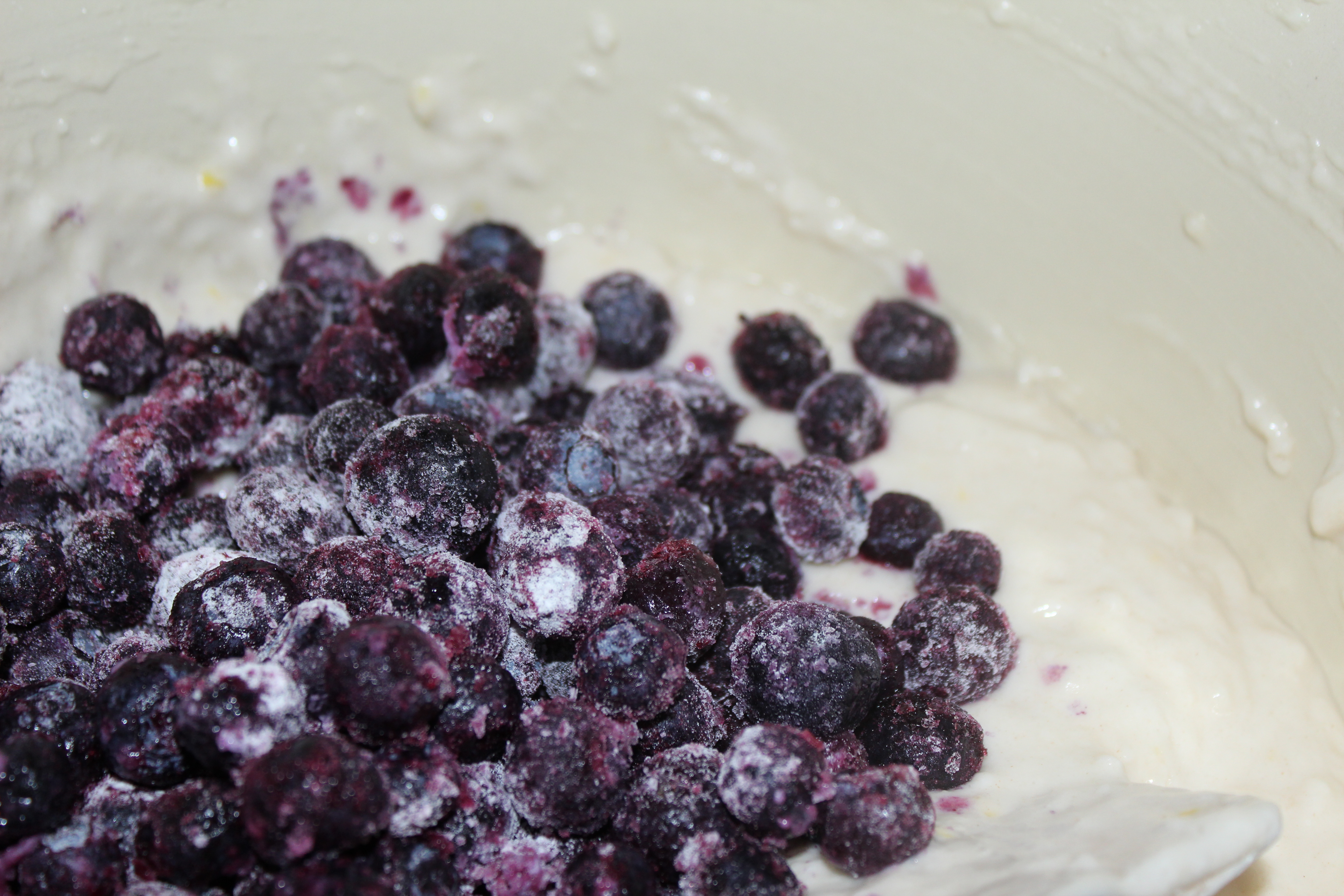 FOLD in the blueberries. This is very important; that is, unless you want purple batter, and if that’s the case, then stir the berries in. Folding allows the berries to be gently mixed in and not smashed into the batter.