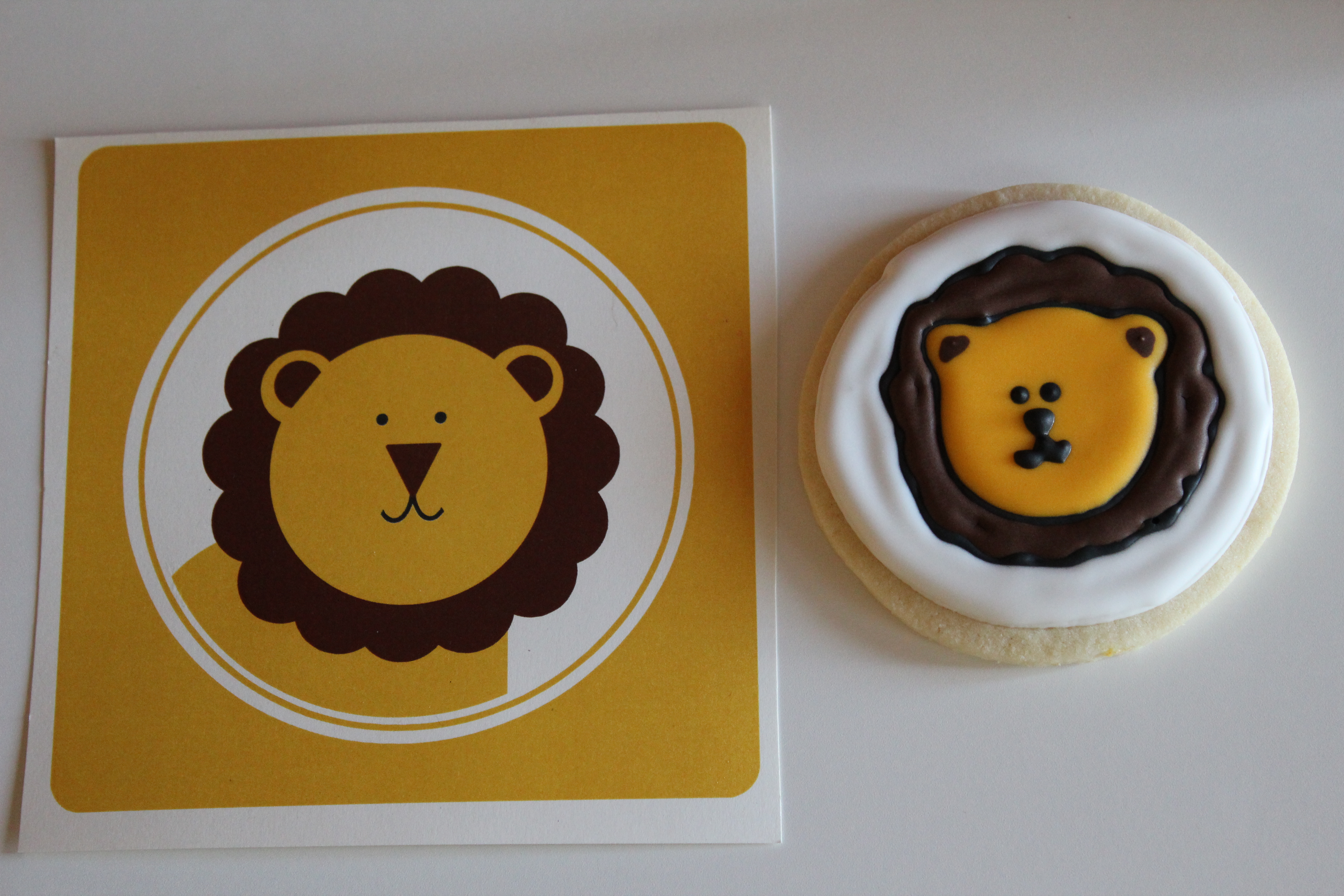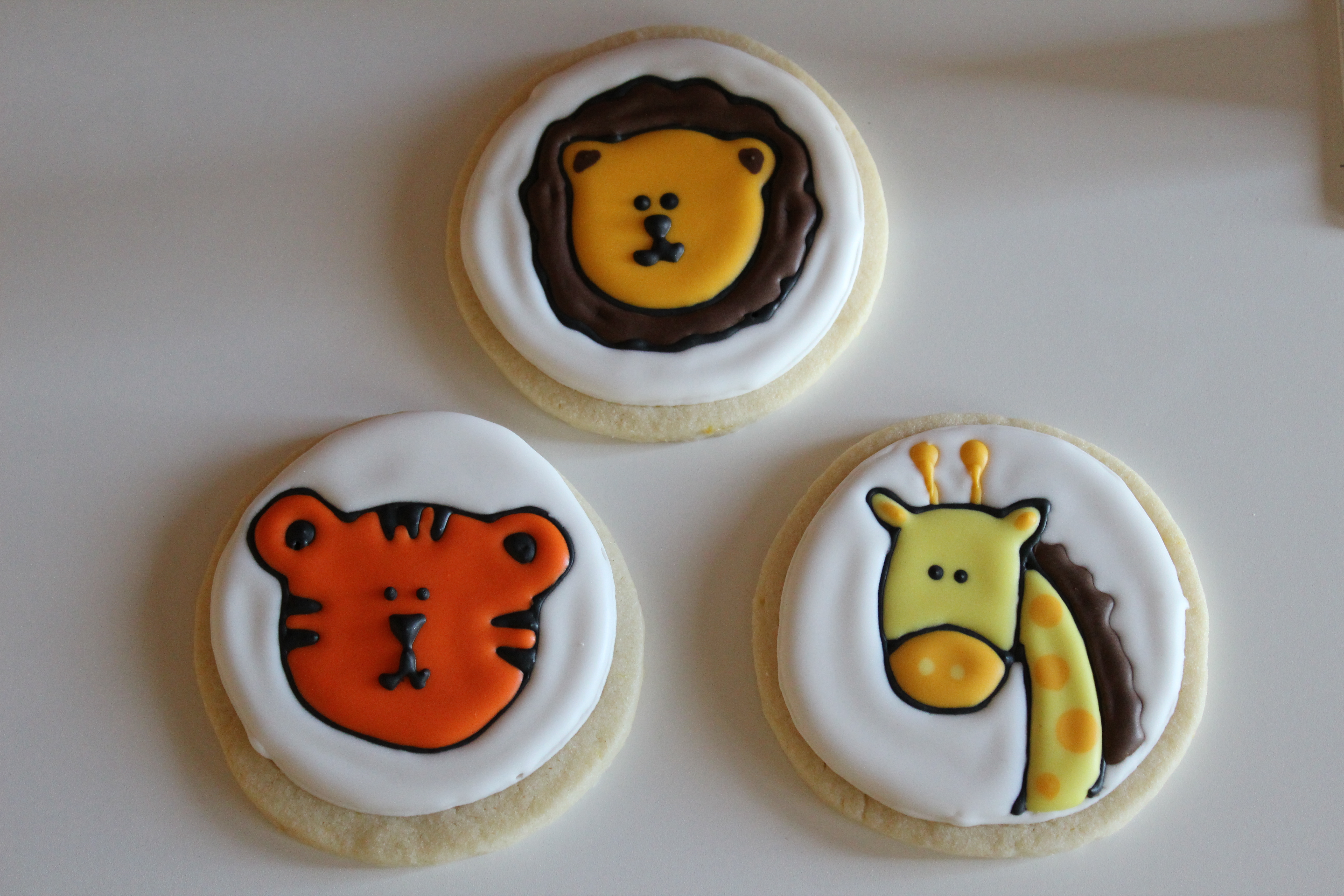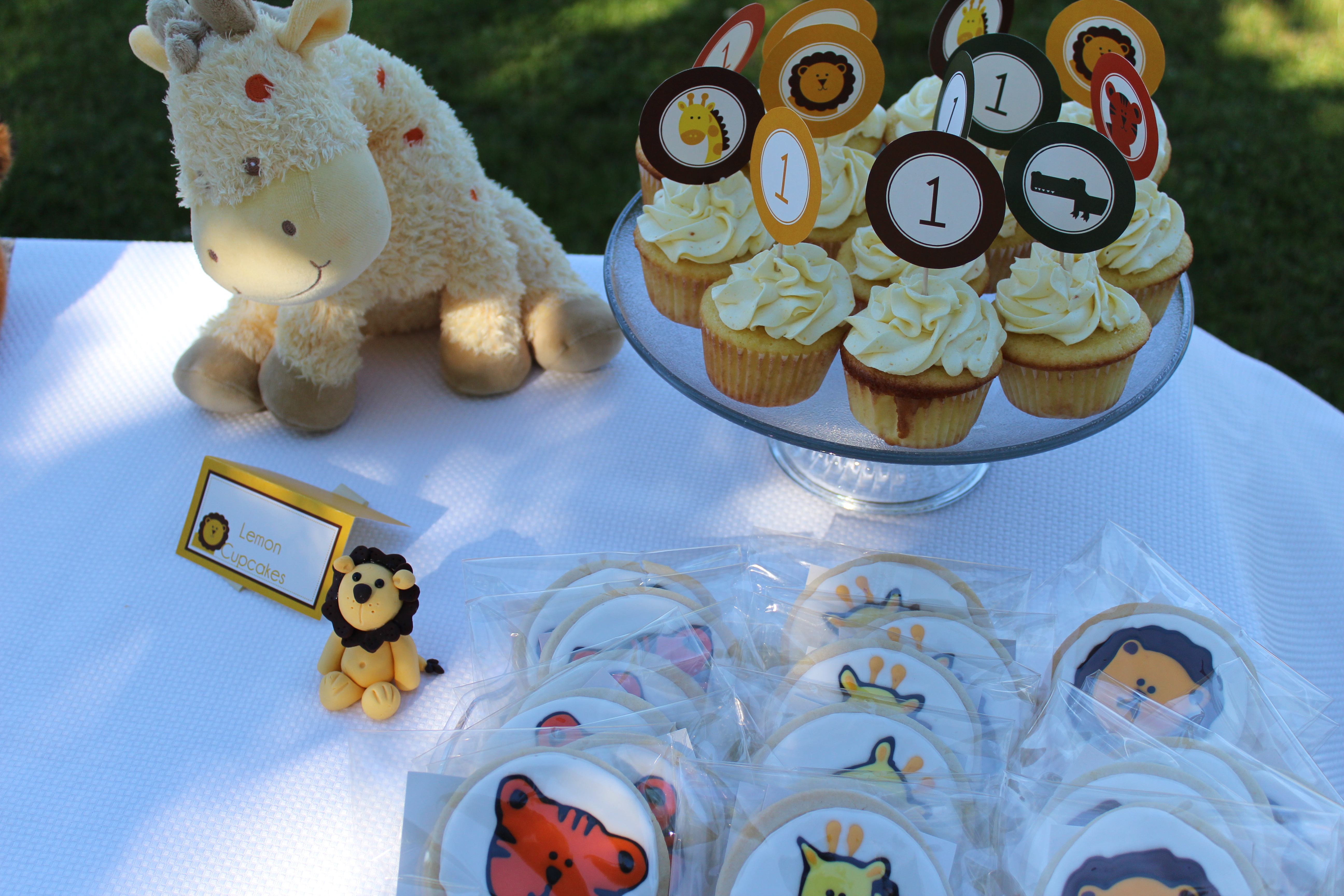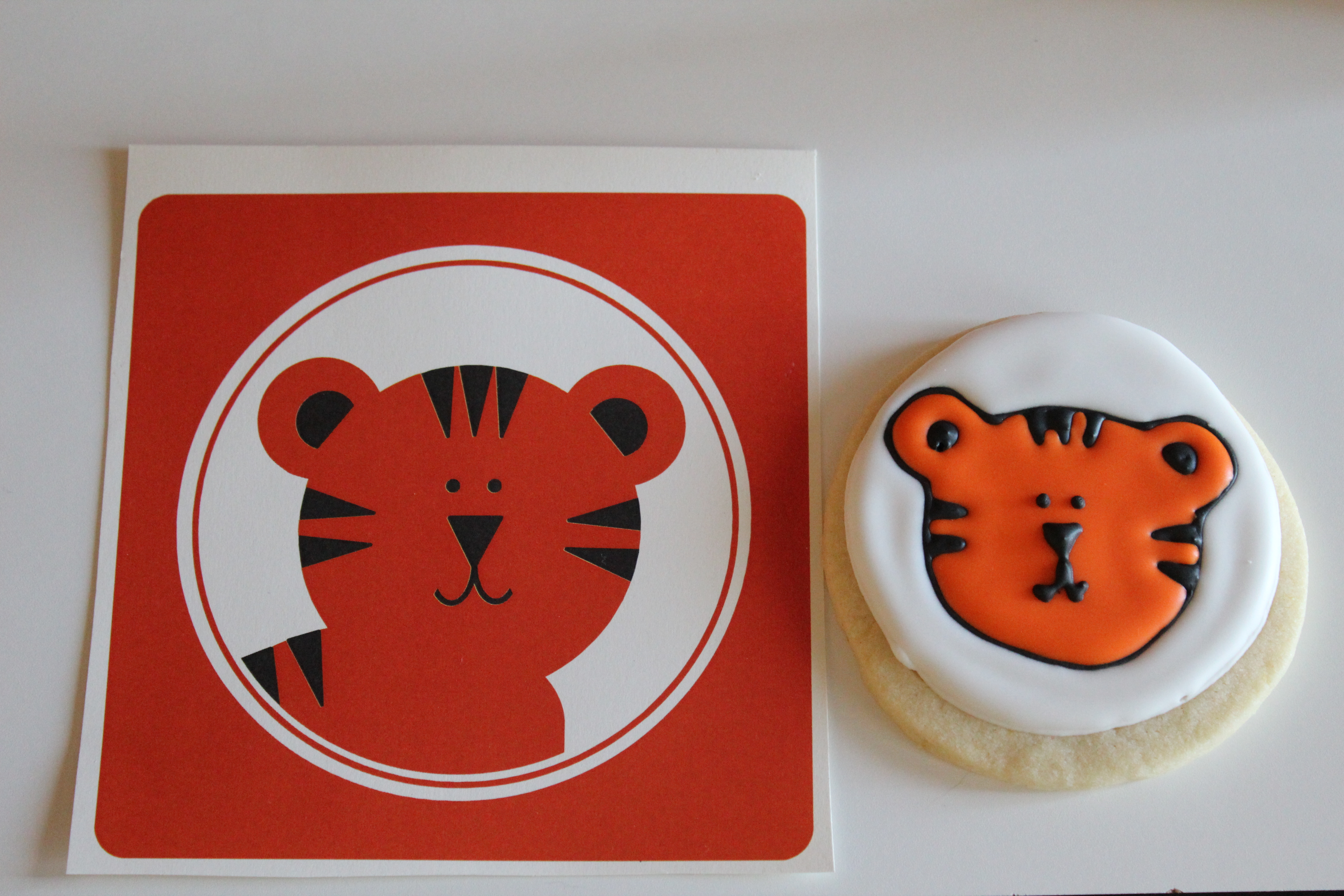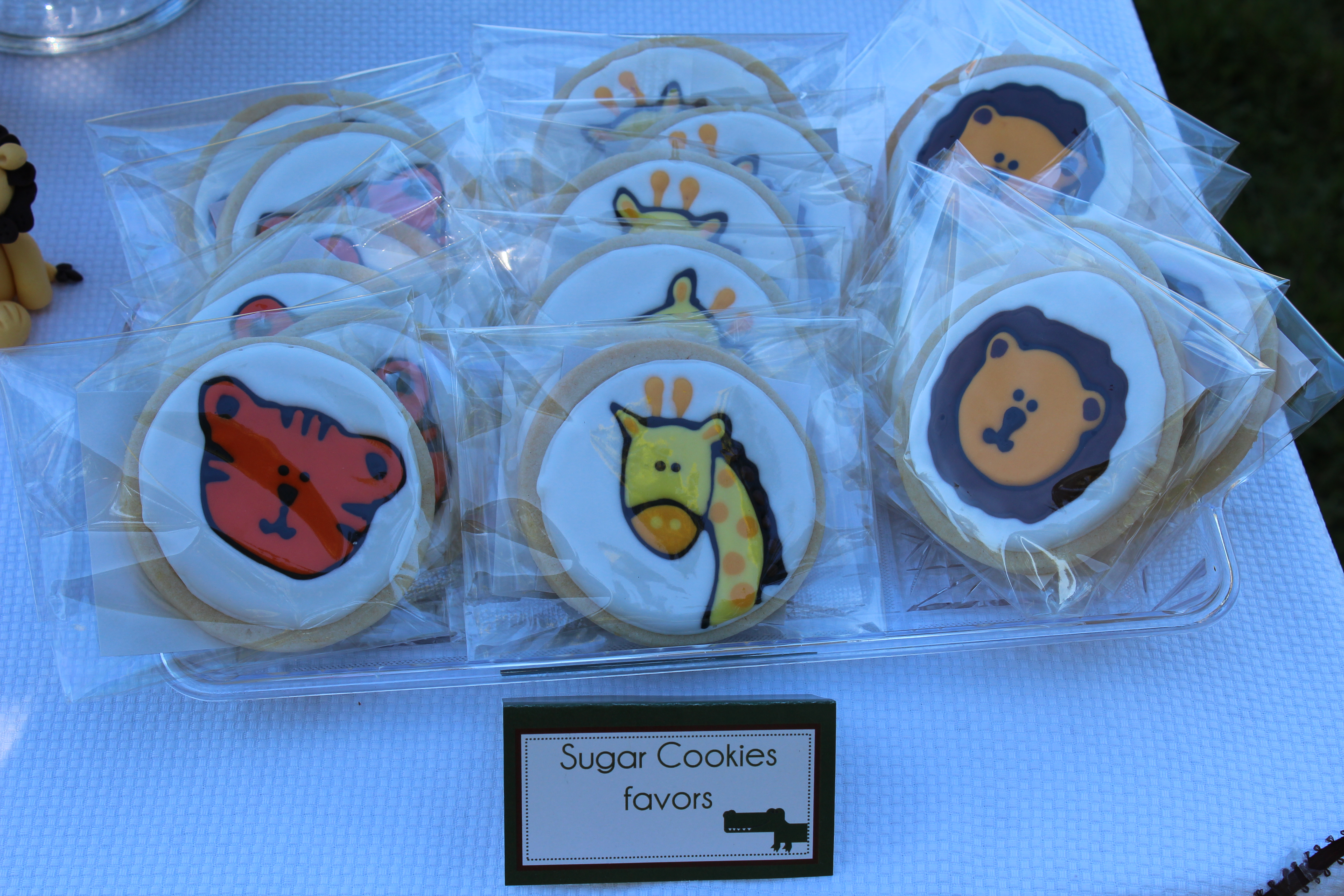 And he’s going to need his first haircut, as mullets just aren’t in fashion anymore. I am going to miss that little mohawk though! As promised, I said I’d show you pictures of his birthday party. Matthew’s nursery is jungle-themed, so I found these really cute printable safari-themed birthday invitations on Etsy. So adorable! Everything coordinated. We had a small gathering of family and friends at a park near our house. The weather was perfect and the company couldn’t have been better. Here are the sugar cookies I made for favors that matched the invitations. The tiger: