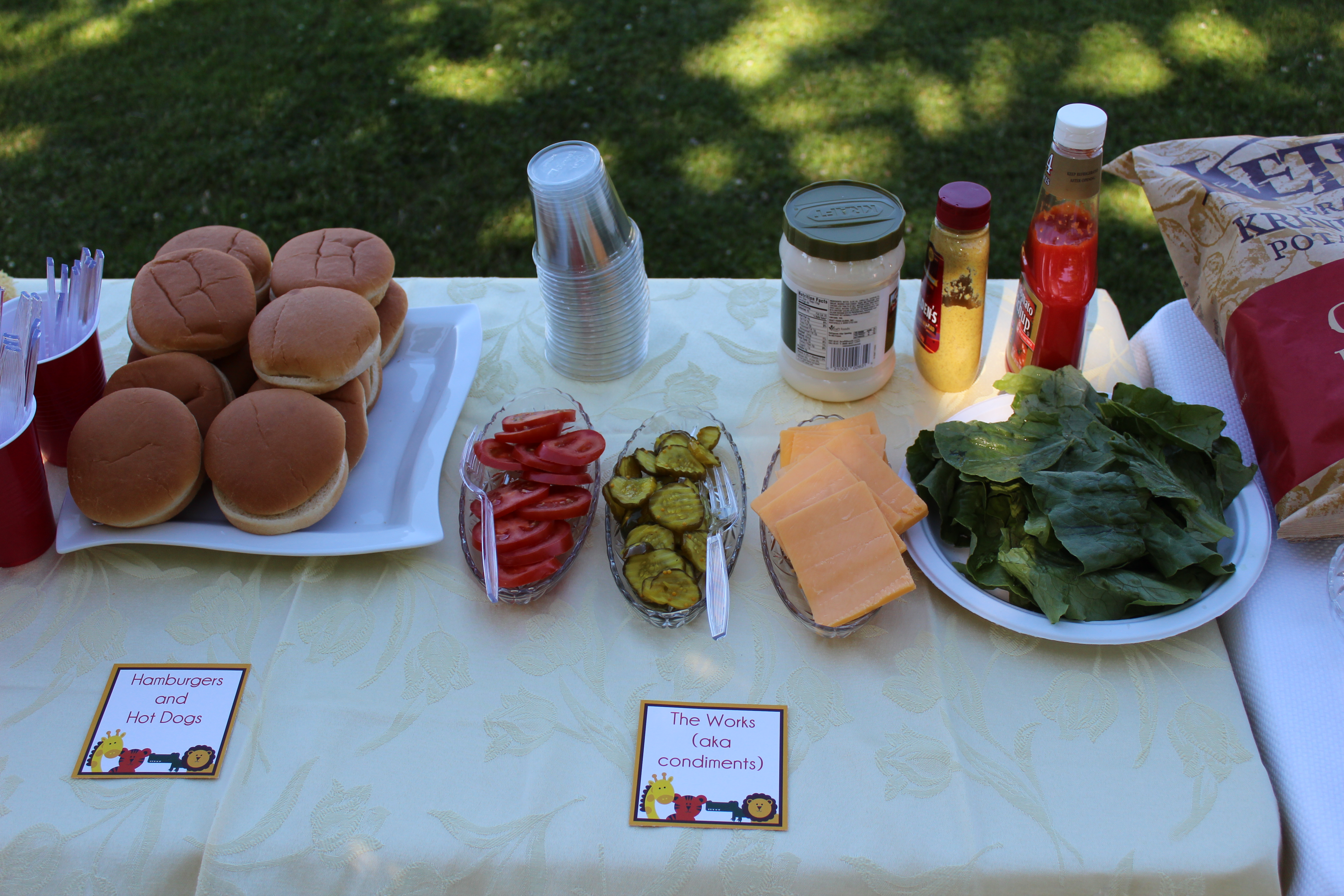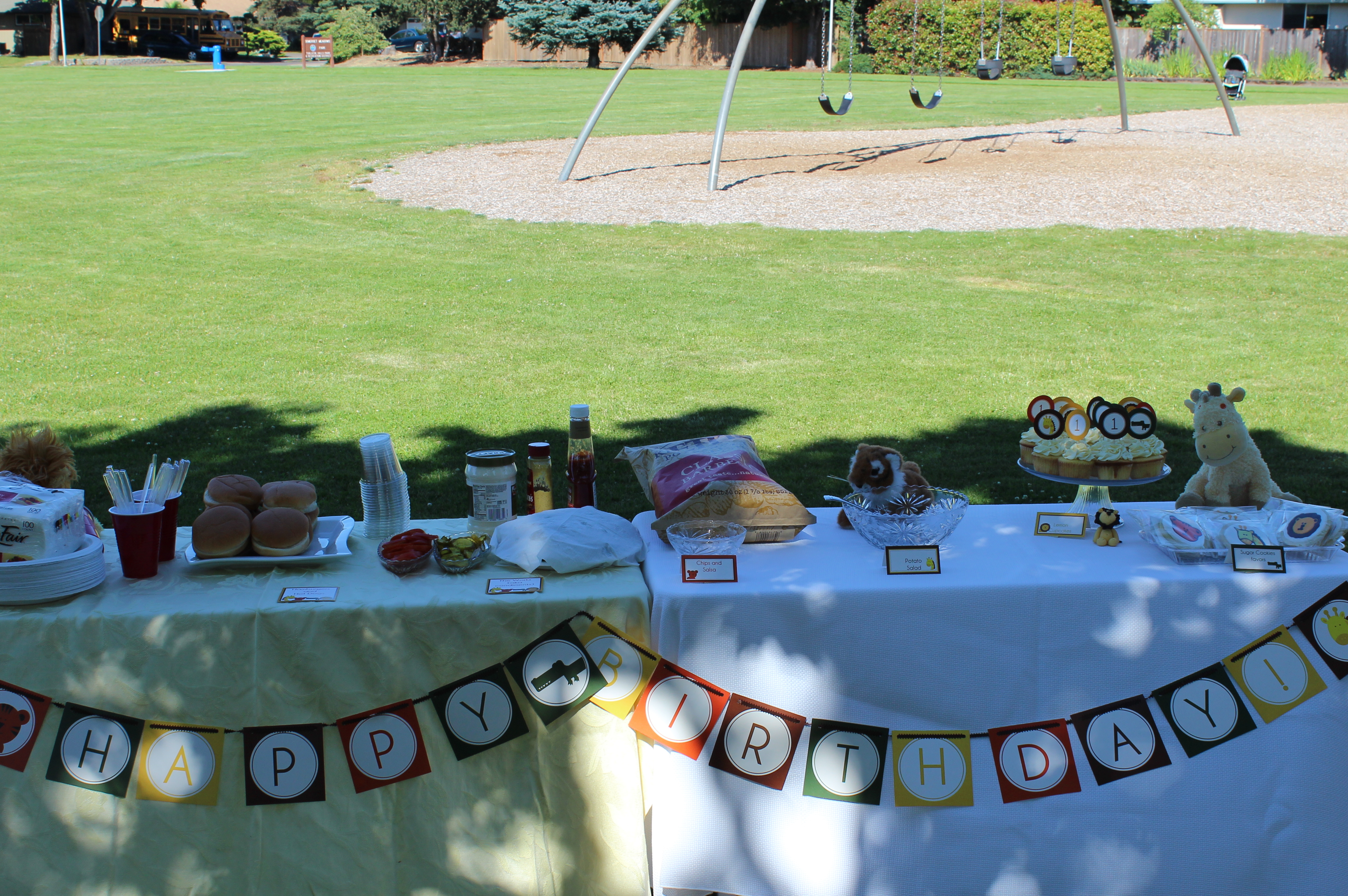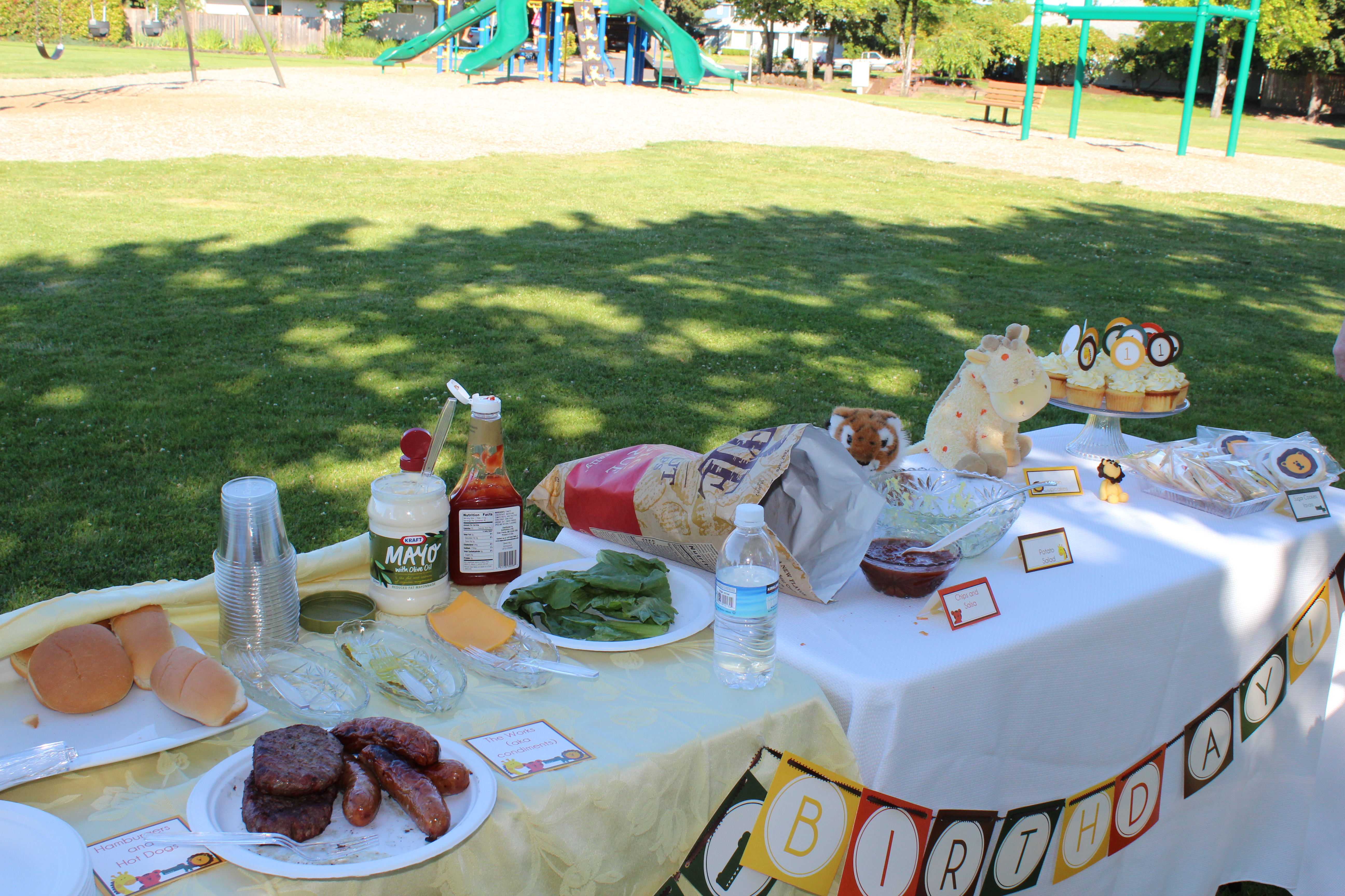 We had our birthday party at the park near our house. We invited our family and close friends to help us celebrate. Here’s the display table with all the food. It was a little breezy Saturday, so if you look closely, you can see a napkin covering the lettuce and a package of napkins on top of the plates so the wouldn’t blow away. (I should have fixed that for the picture, but apparently, I forgot. Oh well, such as life. Thanks to Katie and Cody for putting the happy birthday banner together! It looks so good.)
