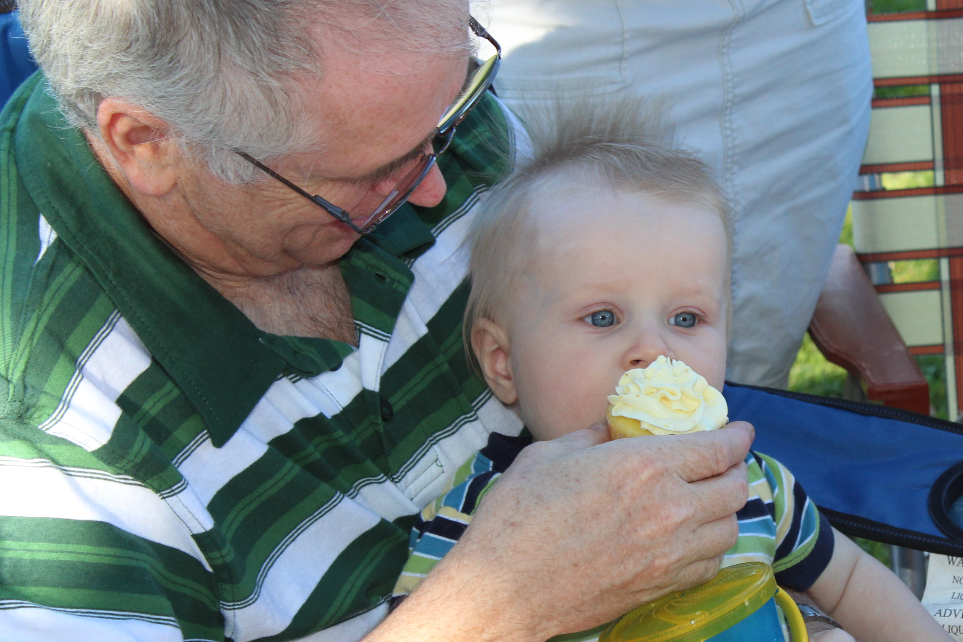 And lastly, here he is eating his first cupcake. His first birthday cupcake, with the help of Grandpa. (They’re matching. I just noticed that–how funny!)