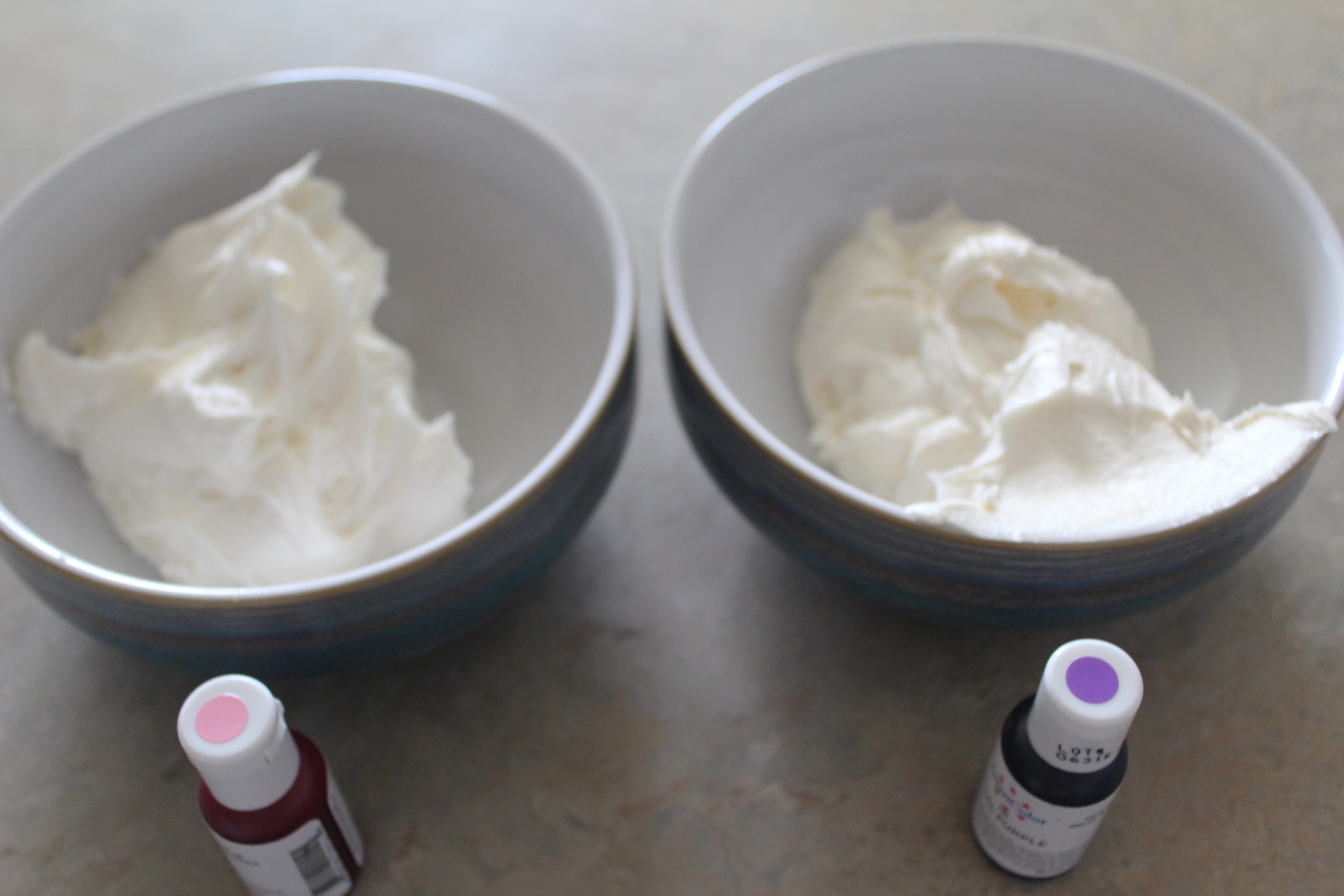 As well as frosting and coloring. (I made a vanilla buttercream and almost always use AmeriColor to color my icings.) Tint the frosting to the coloring you like. When using buttercream, make sure you don’t overmix it. When tinting, fold the color into the frosting, as you want to keep it light and fluffy. Divide the frosting into two and place in separate bowls.