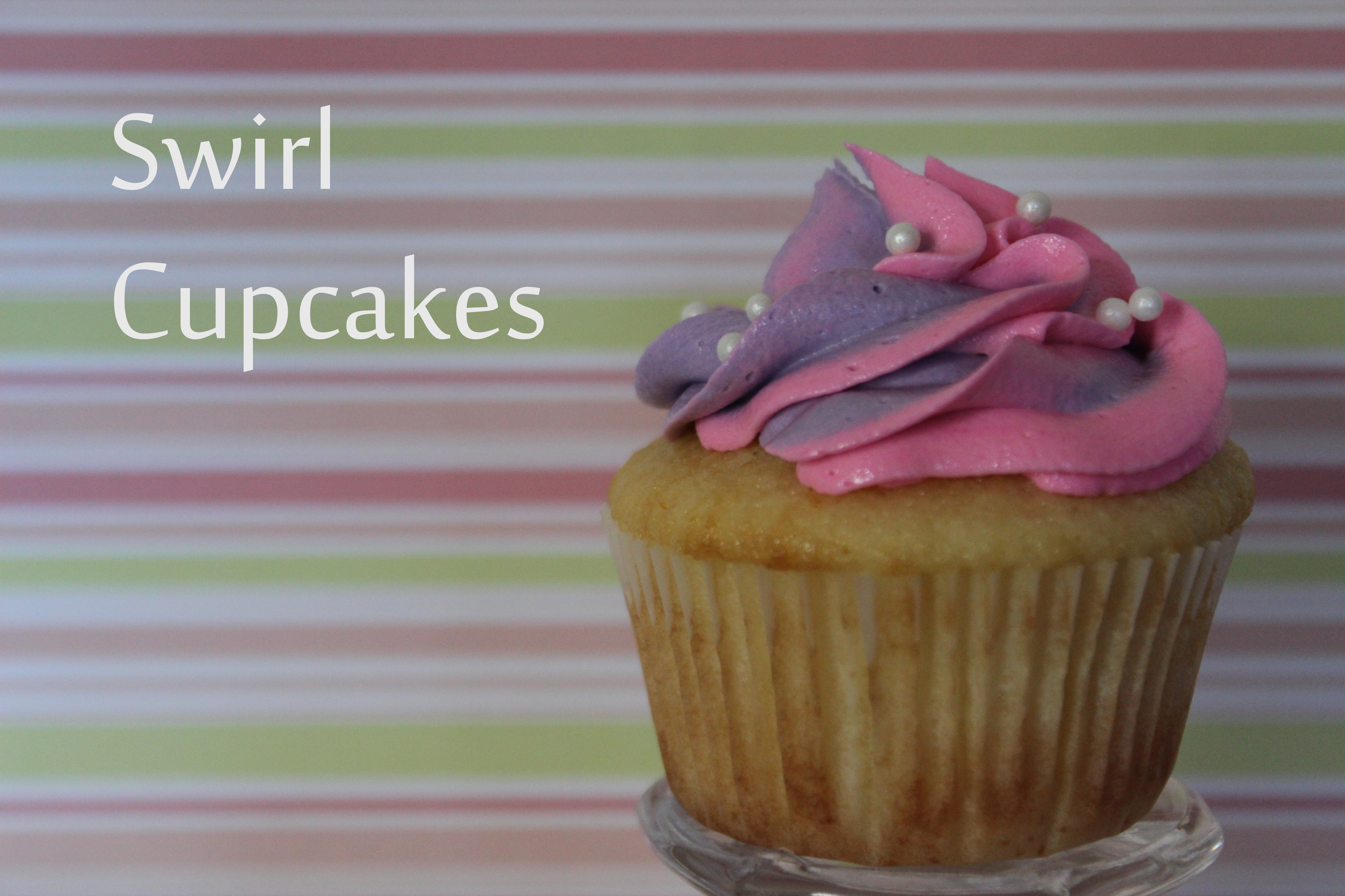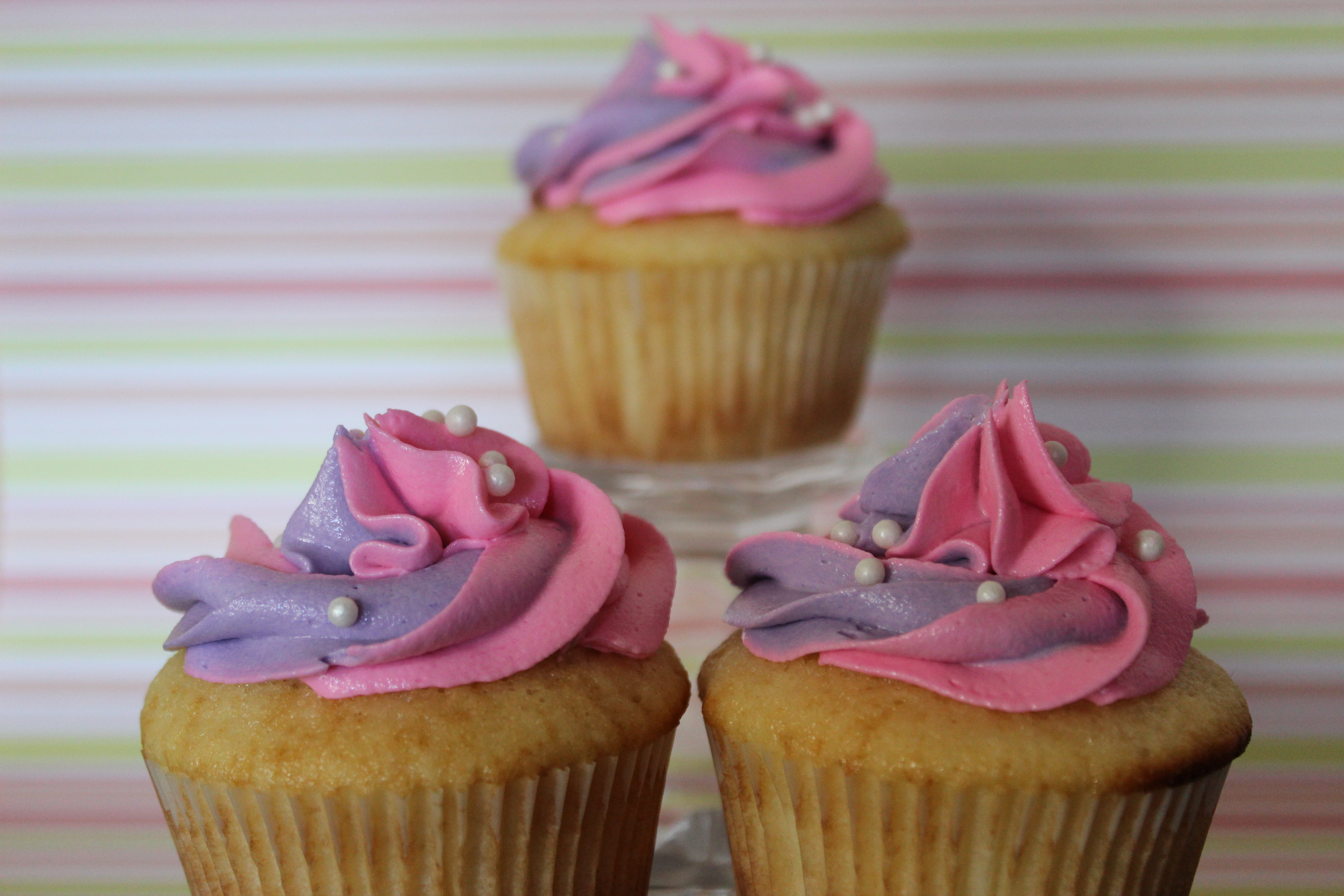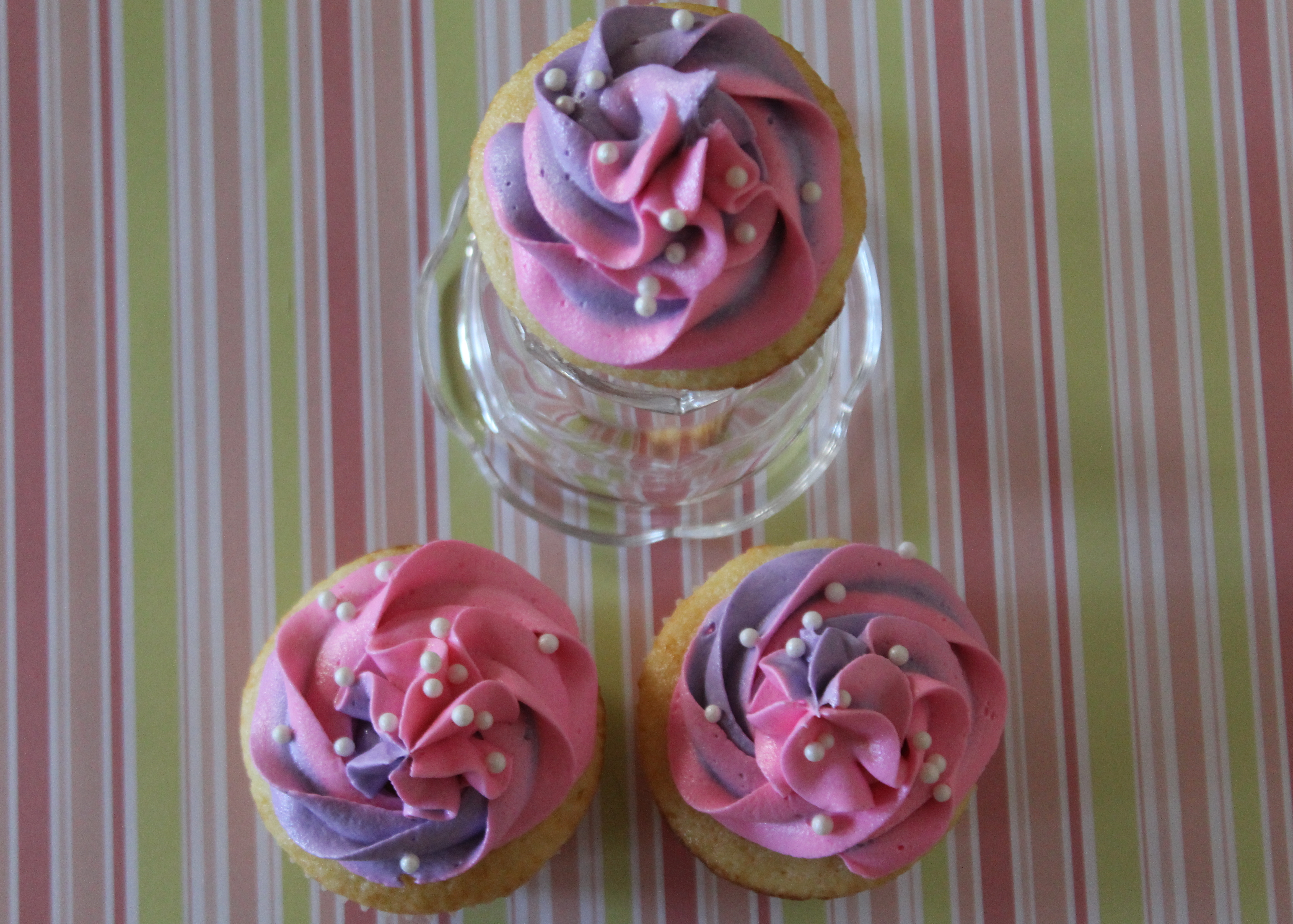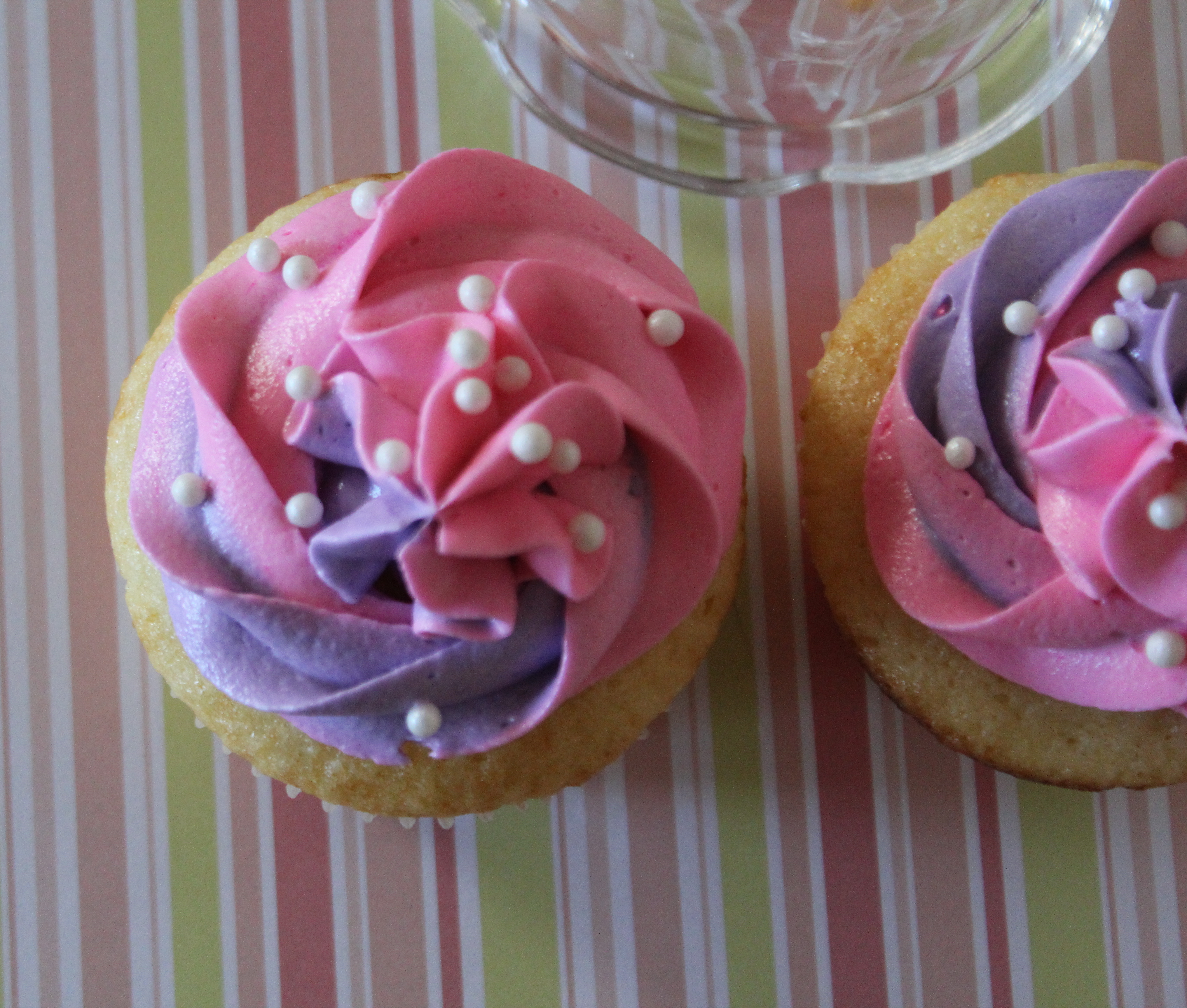 And then twist the top of the bag and squeeze gently. Pipe some out onto a napkin until you get both colors, and then pipe onto the cupcake. I like to add sugar pearls once I’ve finished piping, but that’s just me.