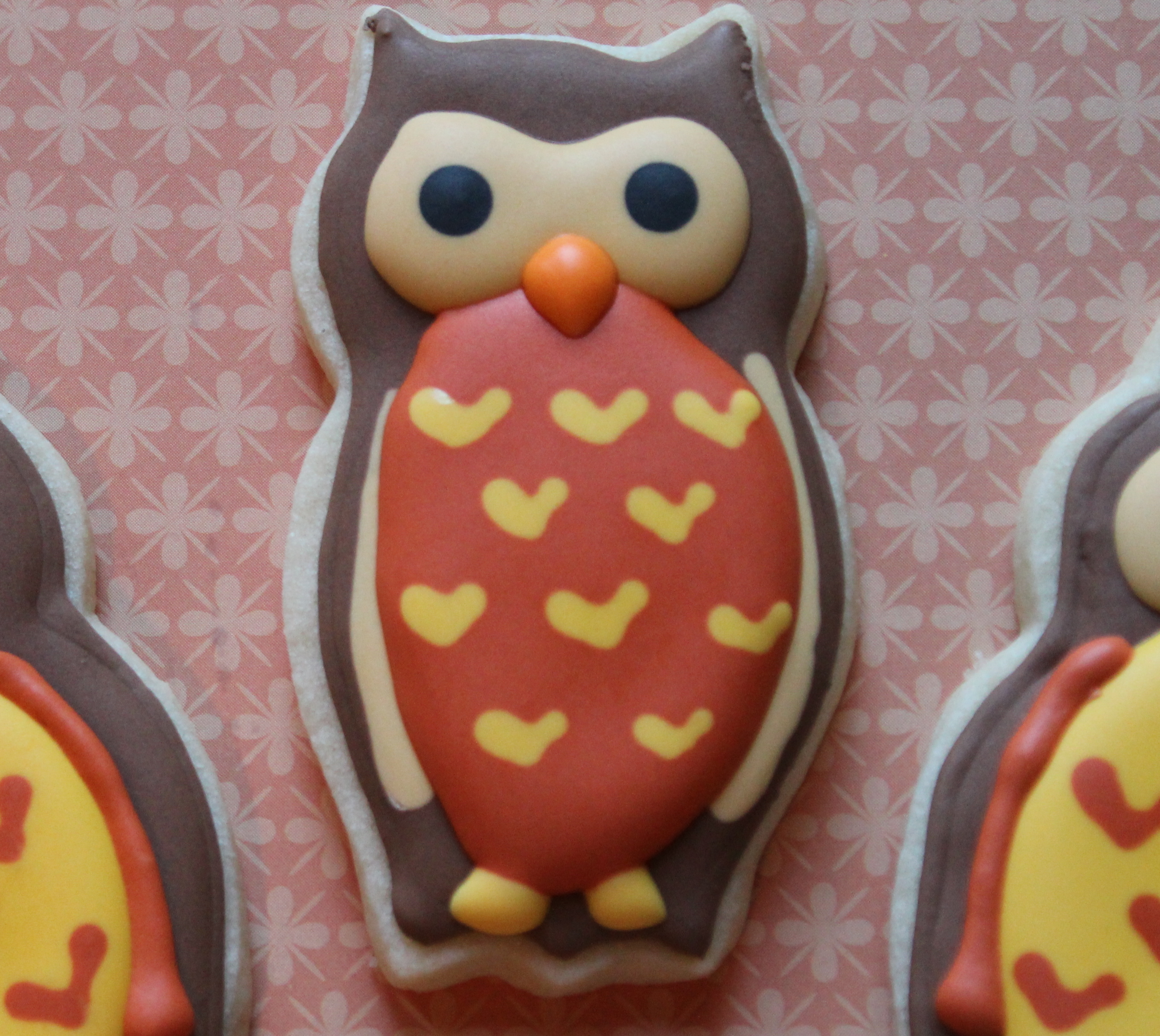 Owls are the latest rage. Didn’t you know? Just go in any department store (in the children’s section) or baby store and you’ll see them. They are all cute and cuddly and come in many different shapes and sizes. (I apparently missed this bandwagon when I decorated my son’s nursery last year. Sadness! We did a jungle theme instead, and it’s worked out just fine. Next kid will get owls.) I made these owl cookies because I wanted to make a fall cookie for Haniela’s giveaway, but you could make them for any occasion–just change the color to suit whatever the function is. Of course you’ll need an owl cookie cutter, but other than that, the rest is your own prerogative.