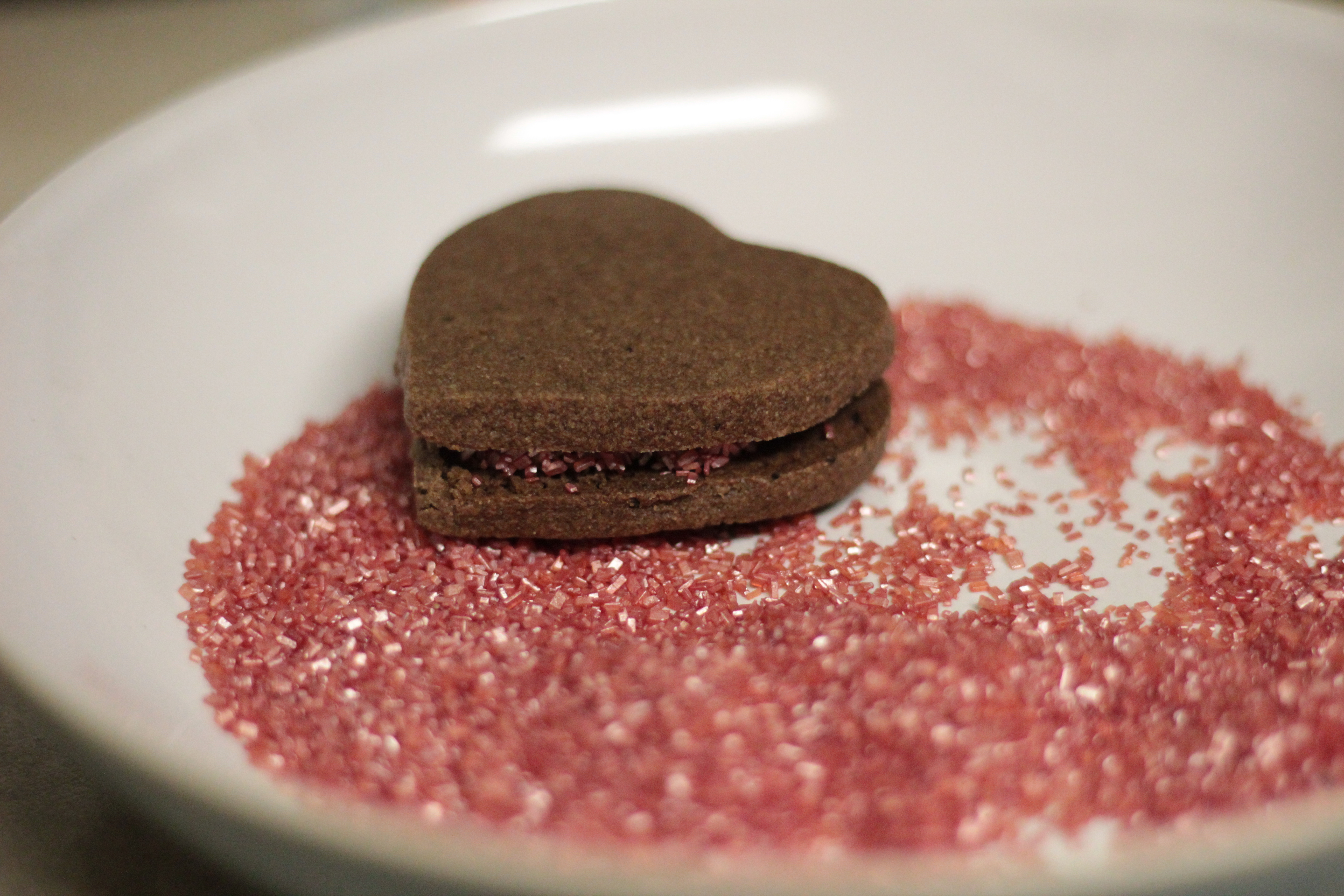 This is such a simple dessert to make for someone special in your life. All you need is heart-shaped cookies, ganache, and sprinkles. Simple, right? Exactly. That’s what I thought. (I’m not being sarcastic, really. I promise it is easy.) I make my chocolate sugar cookies from a recipe in the book Cookie Craft, (which is why I’m not posting it on the blog), but there are some good recipes on-line if you so choose. Using a heart-shaped cookie cutter, (mine were 1 1/2 inches, but you could use any size), bake and fully cool the cookies. (Half are flipped in this photo to make creating the sandwich really easy.)