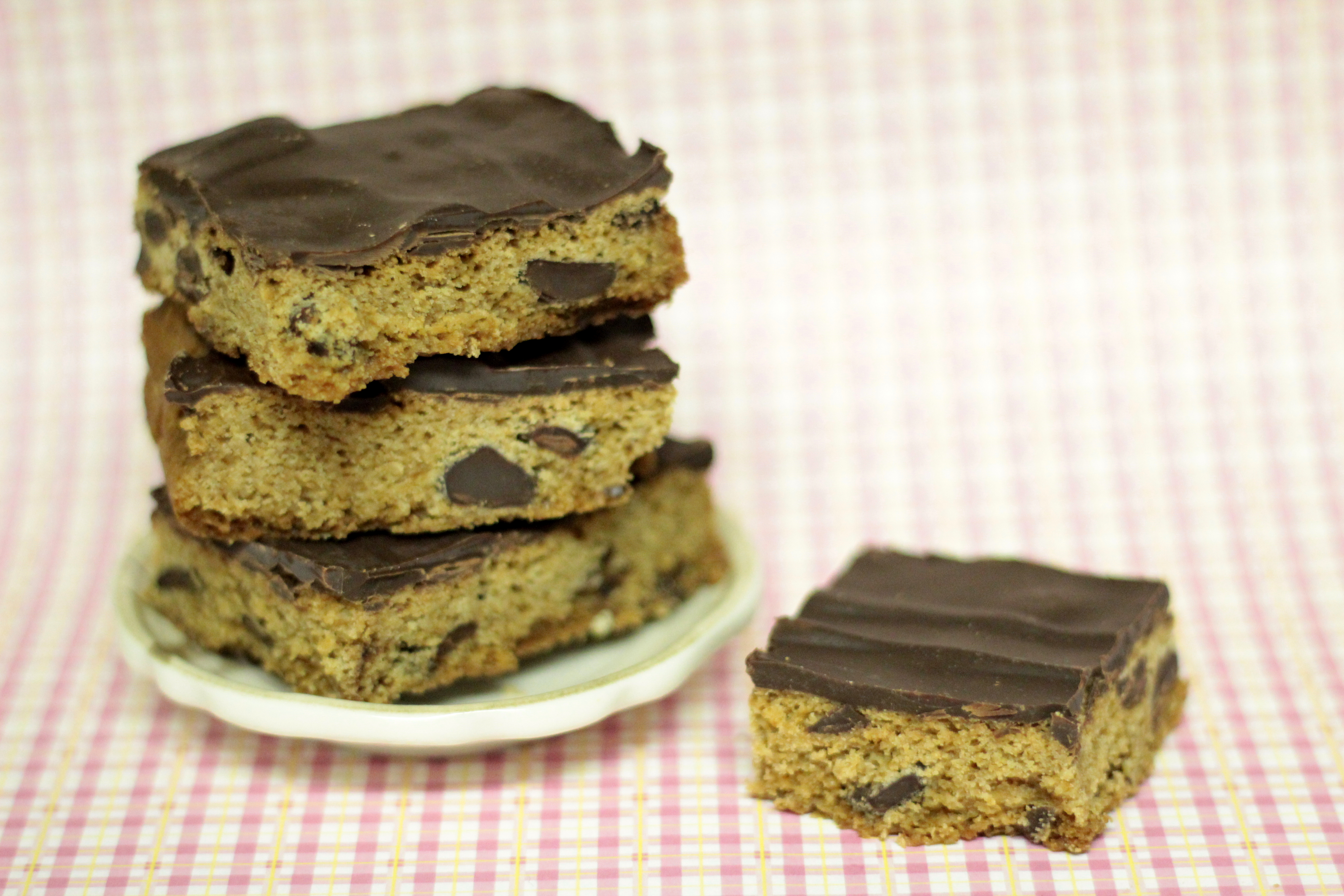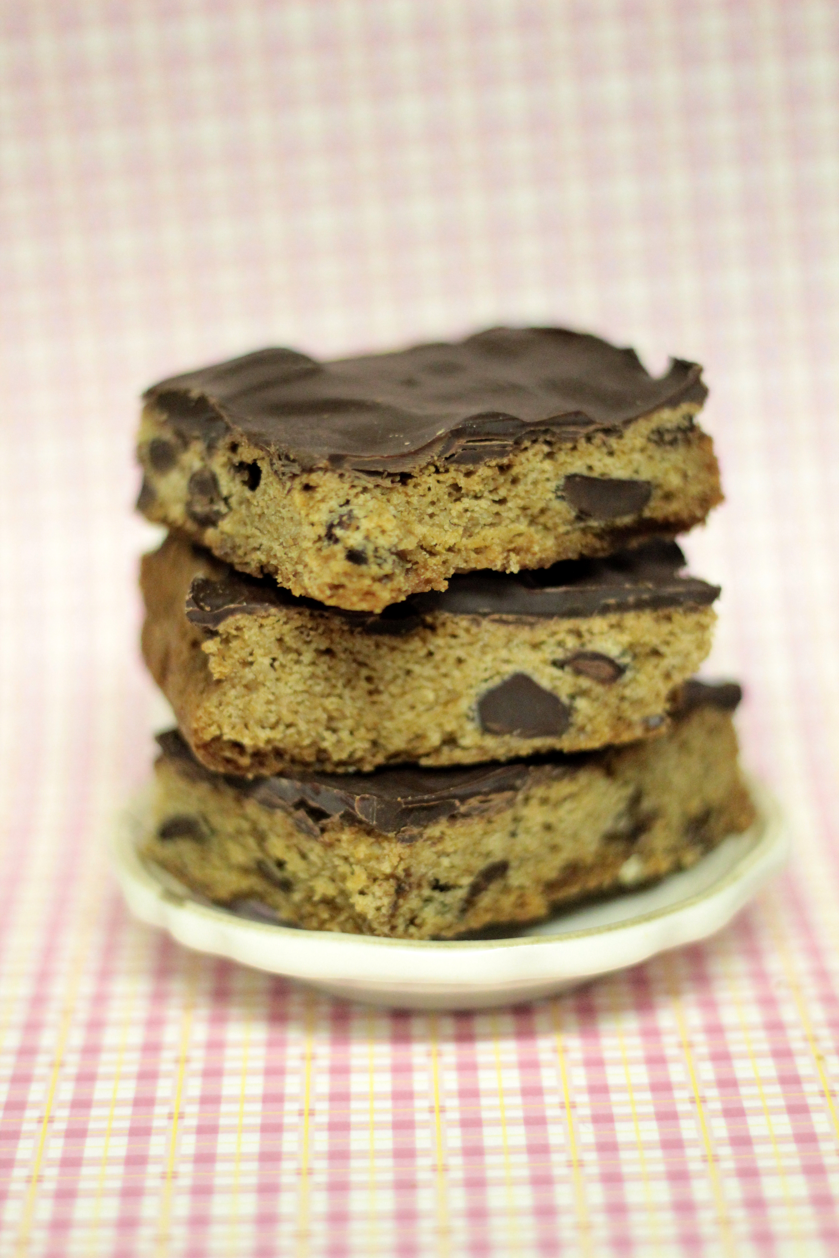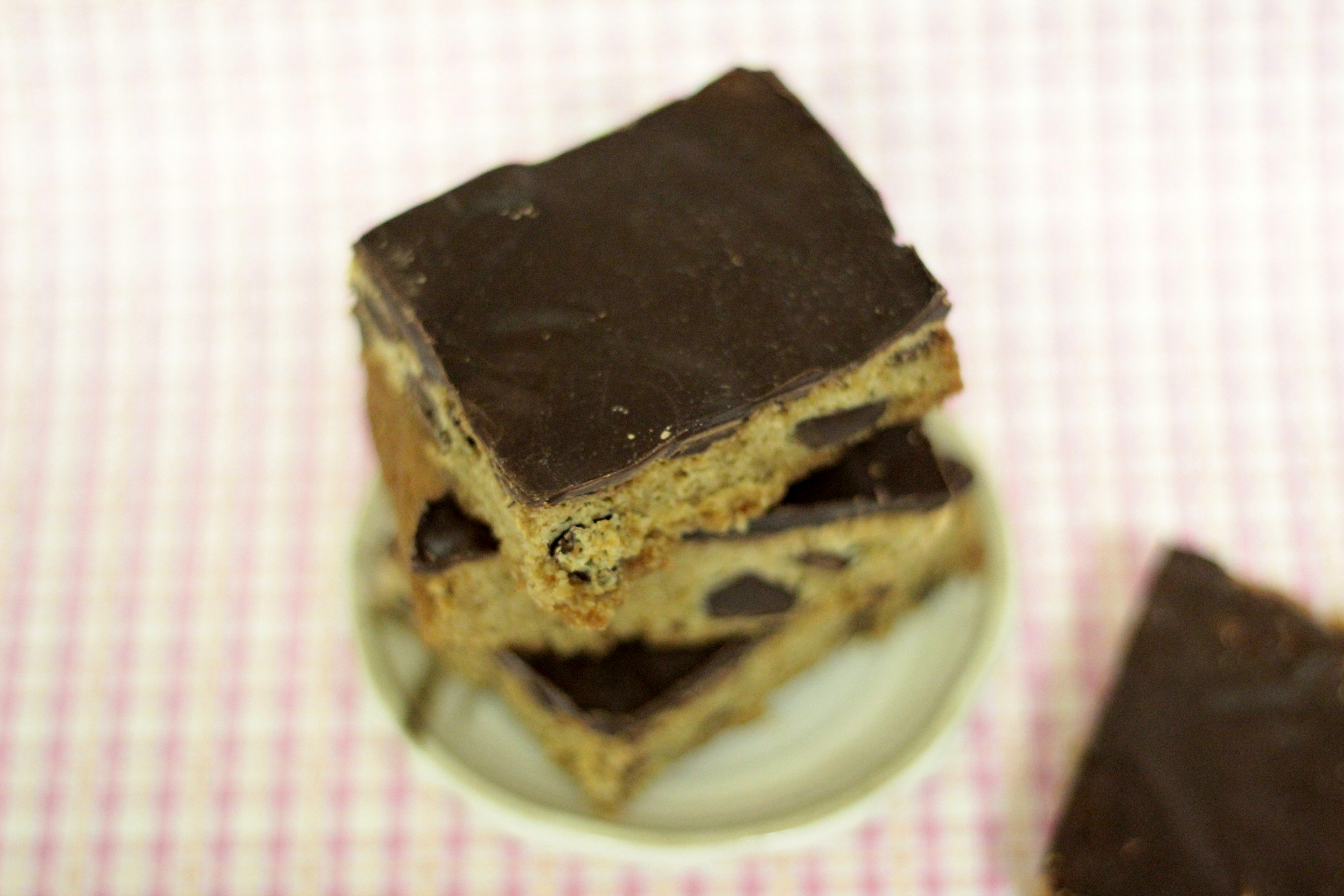 Press dough into mixture (it will be thick). Bake for 20-25, or until edges are golden and toothpick inserted comes out clean. Remove from the oven and sprinkle remaining 1 cup chocolate chips. Wait 1 minute, and using a spatula, spread the melted chips evenly across the bars. Once the bars have fully cooled, put in the fridge to harden the chocolate top.