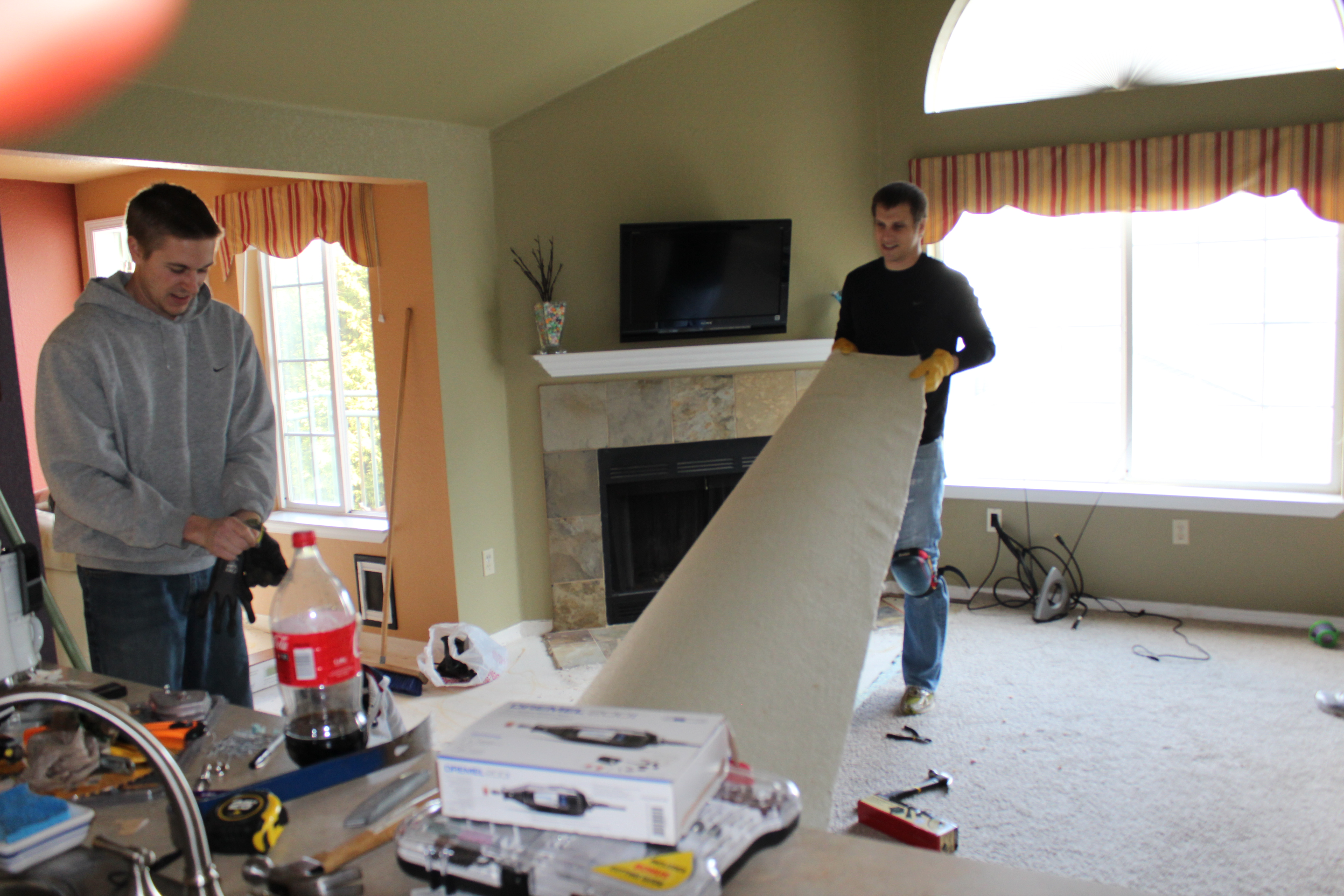 Most of the time I make French Toast, because that’s Eric’s favorite breakfast, but often-times, I make scones, so we can have a quick breakfast come Sunday and Monday. And Saturday was one of those scone-breakfast mornings. But our relaxing, casual, comfy day was turned upside down when Eric began working on installing hardwood in our condo. I didn’t think it’d be that big of a deal, until I realized that our kitchen would soon be piled high with stuff and tools, and our house would have dust everywhere. Add to that that we live in the upstairs unit of a condo with concrete floors, so our used-to-be-cozy house is currently the same temperature as outside. (At least it feels that cold!) Plus I had to leave the house for two days, because a demolition is no place for a toddler to be. In the afternoon, this is what our living and dining room looked like.