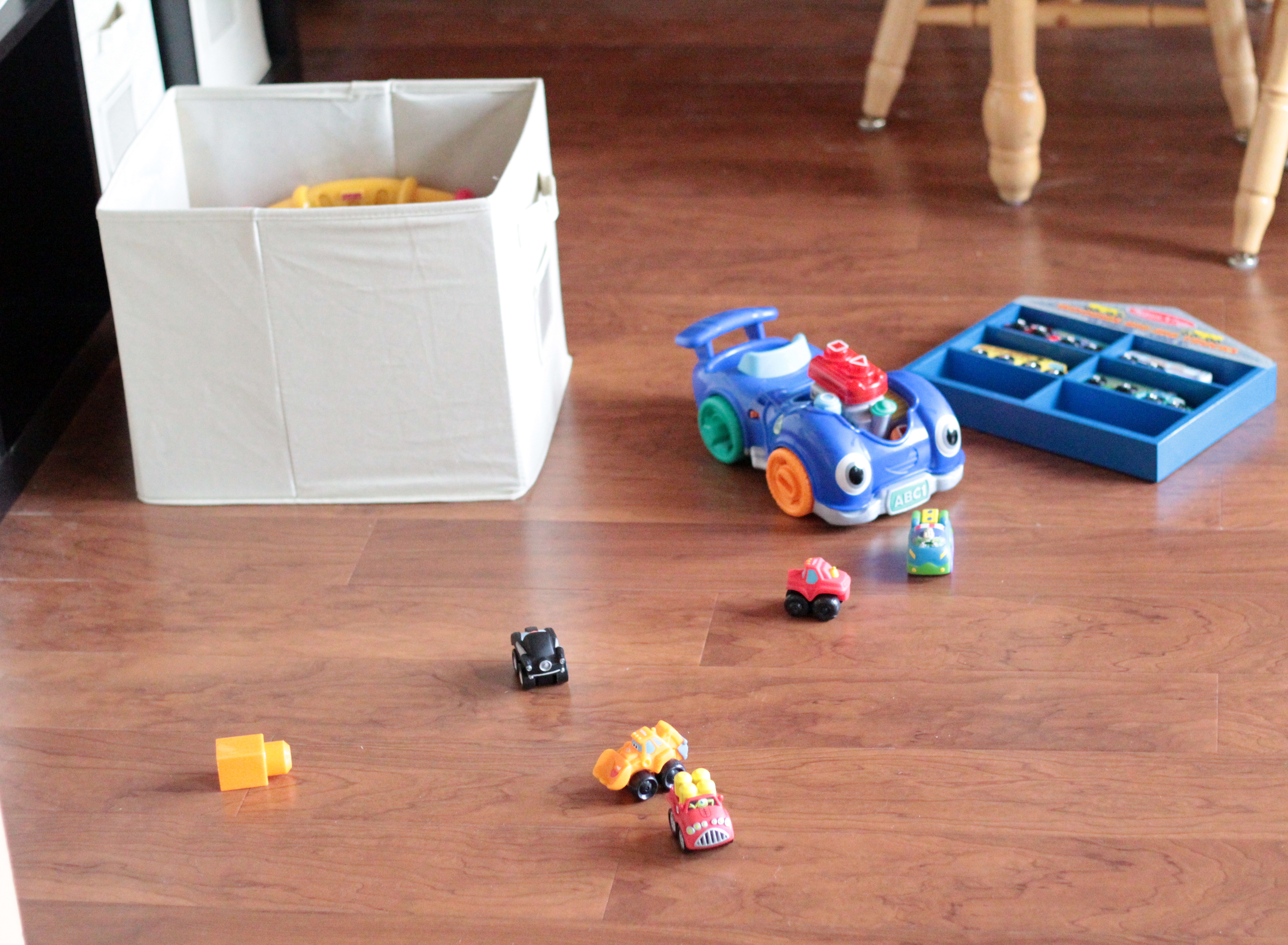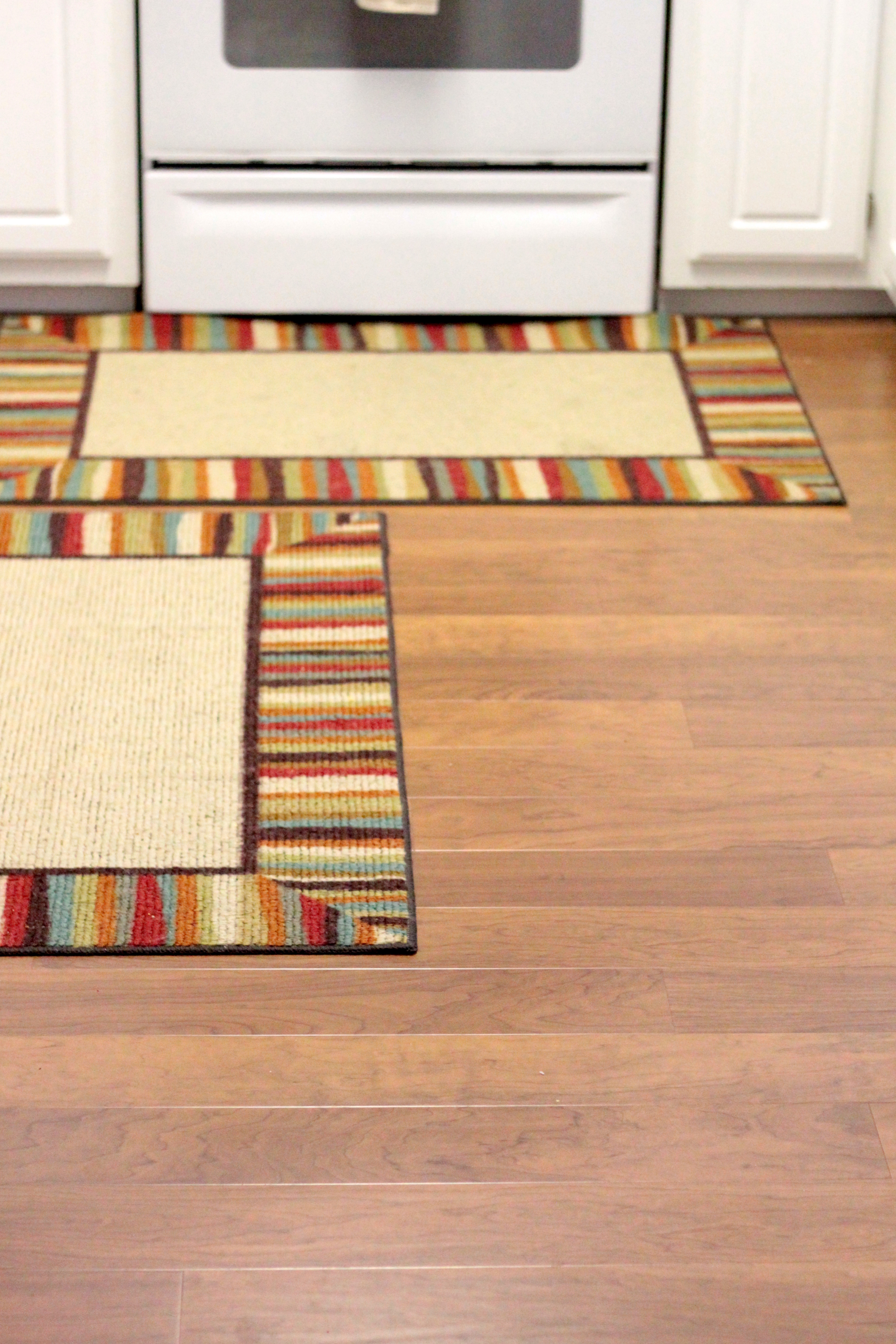 My counters are all cleaned off, but I figured showing you clean counters wouldn’t be as exciting as a beautiful, new floor. And Matthew particularly likes the new floors. It makes it easier for him to move his trucks around.