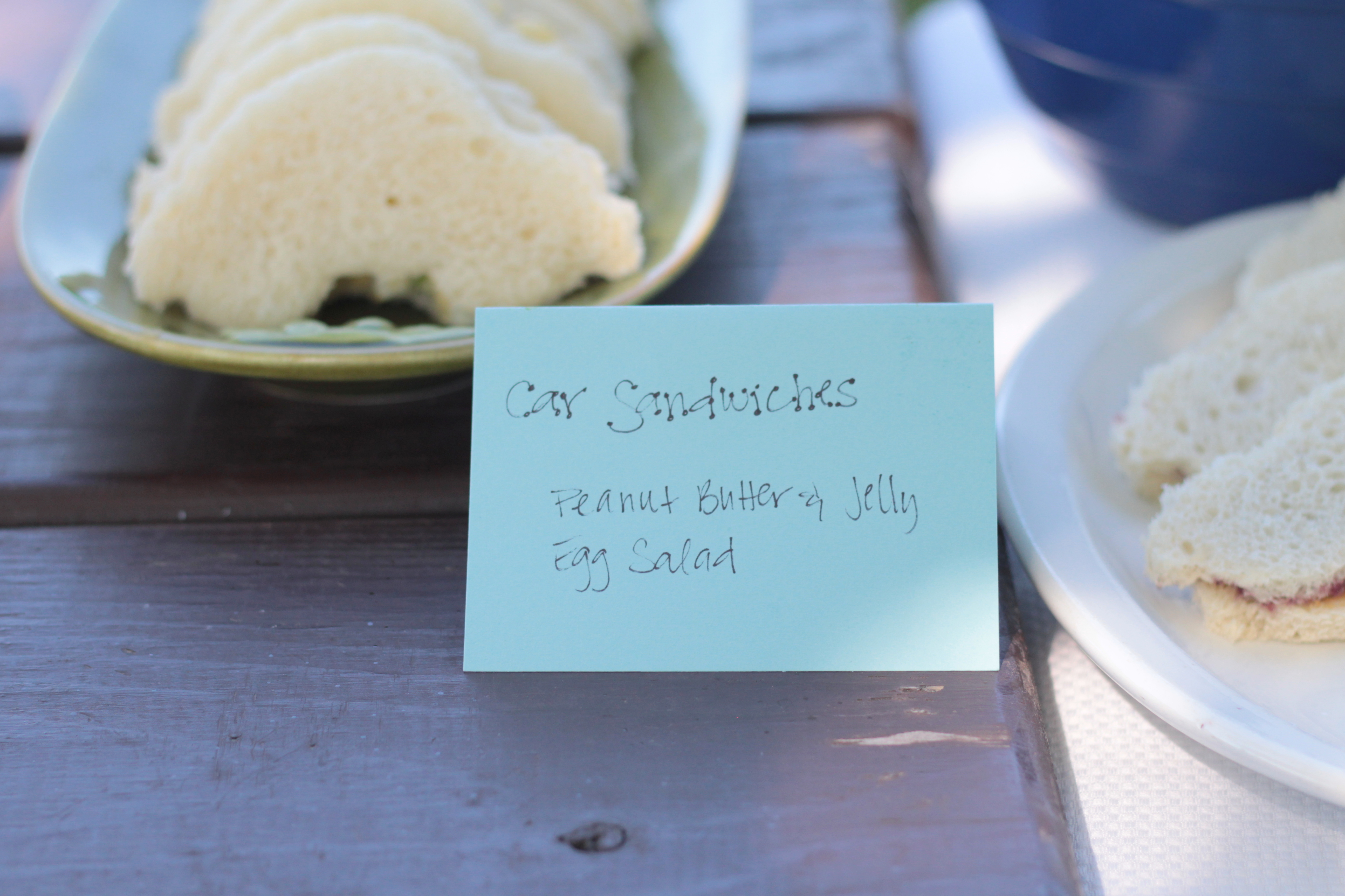 I also made egg salad sandwiches and peanut butter and jelly sandwiches, and had them in the shapes of cars. I found this really cute car cookie cutter and cut out bread using the cutter.